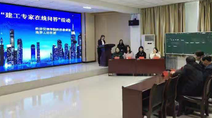 2018年11月8日下午,经济管理学院经济教研室联合造梦工坊社团举办的“建工专家在线问答”活动顺利举行。beat365中文官方网站教学院长郭国庆、经济管理学院院长董笑予、建工专家、建工专业老师彭丽娟、张迎春等四位老师及17、18级所有建设工程管理和工程造价专业的所有同学参加了本次活动。
