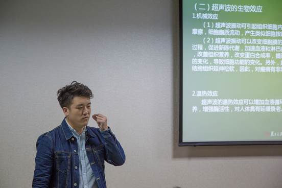 首先由罗龙鼎老师培训常用物理疗法,培训内容包括声能疗法、光能疗法、电磁能疗法、冷热疗法、机械能疗法、水能疗法。