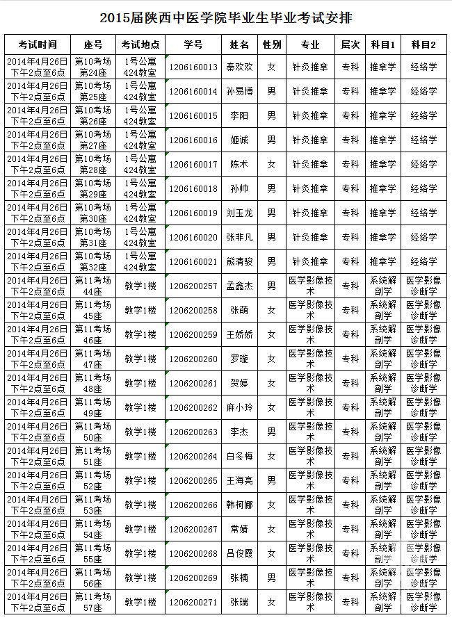 凡属我院2015届陕西中医学院继续教育学院的毕业生,请详细查看各专业考试科目、考试时间、考试地点及相关安排,各毕业生必须严格按照考试安排时间、地点参加毕业考试,如未能参加毕业考试及完成相关通知要求的,一律视为自动放弃毕业证办理,责任由学生本人自行承担。现将具体要求通知如下: