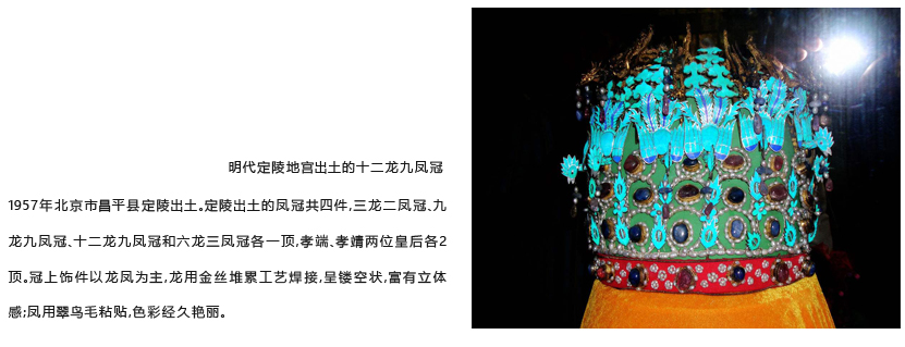 随着手工业的发达,女性发饰的制作技巧较之前更为精细。在继承传统的技术之同时,采用“烧制 珐琅”新法,使得饰物的造型与设计上更为复杂、精致,有特色。从明定陵地下宫殿出土的四顶皇后 凤冠,是唯一存世的古代华夏女子最高品级的头饰。