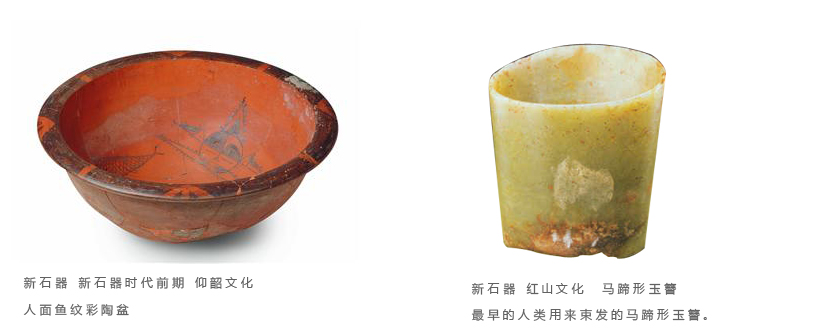 陶器烧造技术提高扩大了装饰品的范围,出现了我国最早的玉文化(仰绍文化以及 红山文化),这边就是最早的人类用来束发的马蹄形玉簪。