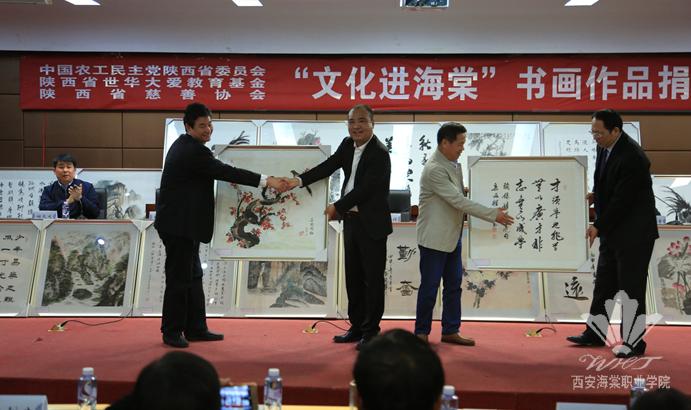 ——举行“文化进海棠”书画捐赠活动。近日,由中国农工民主党陕西省委员会、陕西省世华大爱教育基金、陕西省慈善协会联合举办的“文化进海棠”大型书画捐赠活动在我院学术报告厅隆重举行。中国农工民主党陕西省委员会专职副主委、陕西省政协副秘书长马鹏程,该院理事长王卓、党委书记张桂荣、院长冯居秦及11位书画名家出席活动,学院300余名师生代表参加了活动。