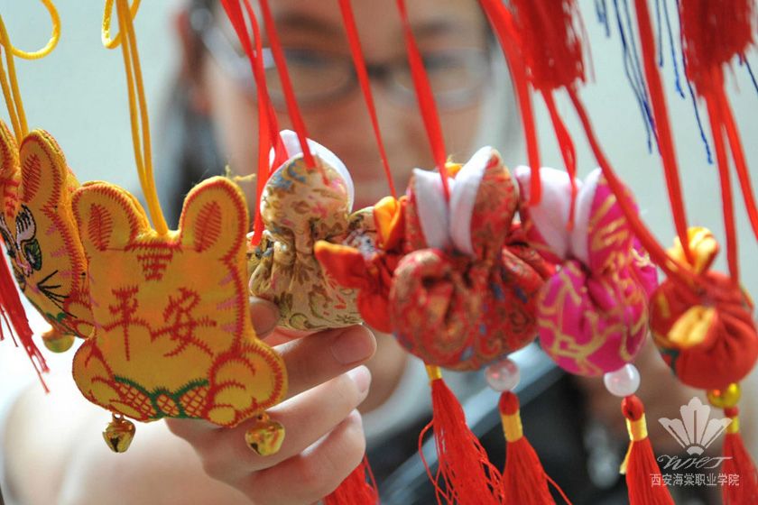 端午节小孩佩香囊,传说有避邪驱瘟之意,实际是用于襟头点缀装饰。香囊内有朱砂、雄黄、香药,外包以丝布,清香四溢,再以五色丝线弦扣成索,作各种不同形状,结成一串,形形色色,小巧可爱。