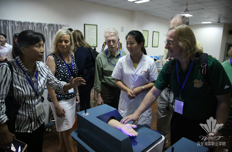 随后,代表团一行实地考察了我院的医学美容实验实训中心和中医美容博物馆,深入了解我院的特色专业建设。考察过程中,代表团们气氛活跃,对我院特色的中医美容文化充满好奇,与我院接待人员相谈甚欢。在讲解员的耐心讲解下,纷纷上前体验先进的美容仪器设备。走进中医美容博物馆,面对博大精深的中医美容历史文化,来宾们更是赞不绝口,不时拿手机拍照留念。