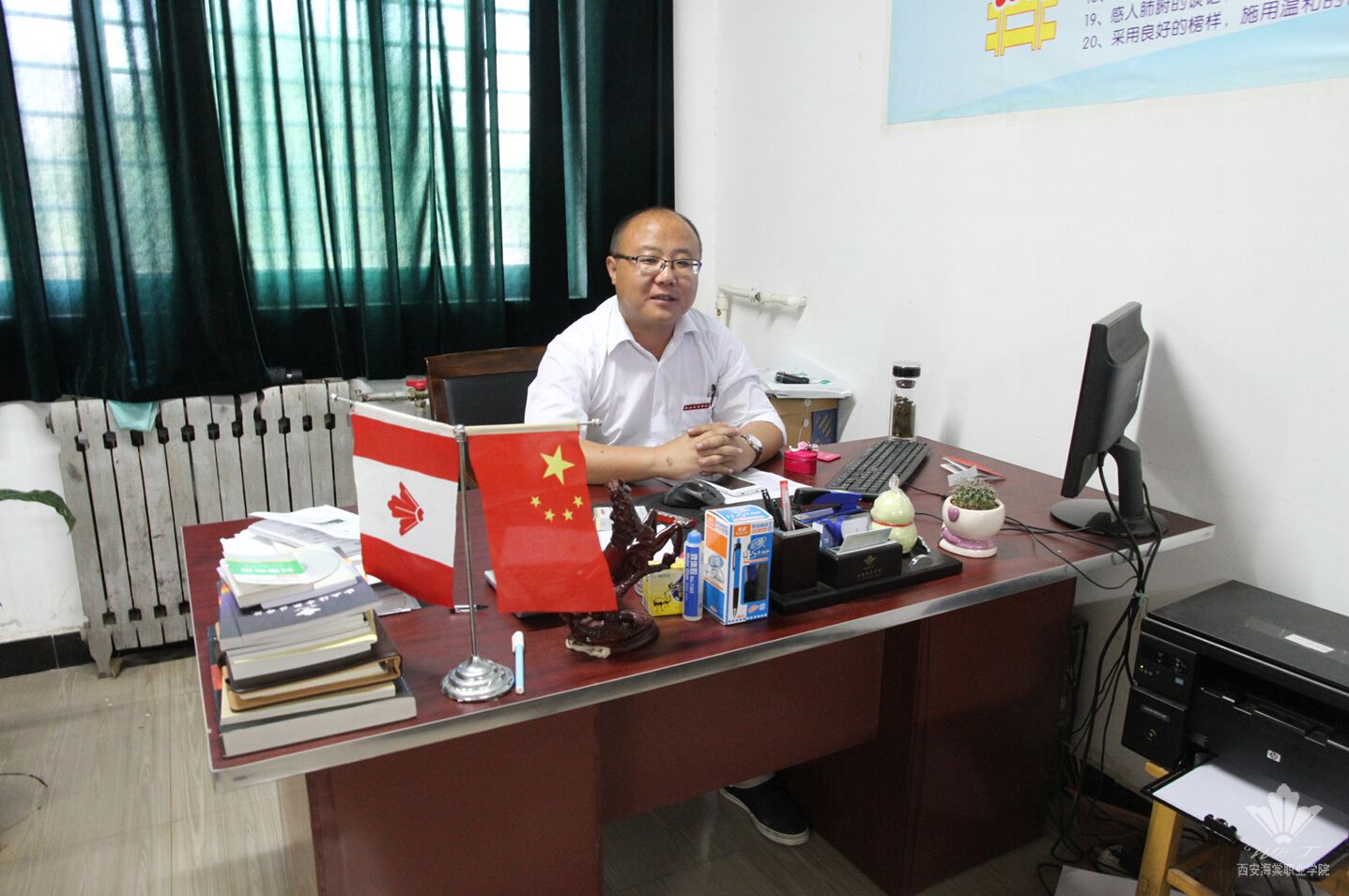 朱老师是山东人,2011年来到西安海棠学院任教。通过自己不断的努力和在工作中的突出表现如今已成为医学技术学院的科长。管理整个医学技术学院的相关工作,还兼任3个班的辅导员,朱凤林老师的工作量很大。刚进他办公室的时候,他正忙着工作,旁边还有几位老师在等他,不时还有学生进来询问事情,事情繁杂但他处理的游刃有余。几分钟后他终于忙完了,过来坐下亲切地询问记者,完全没了有刚进门时的严肃。