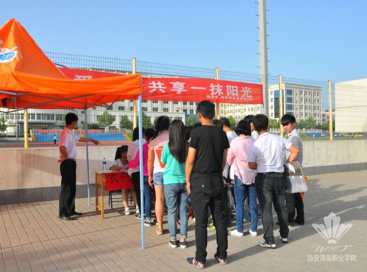 为弘扬“奉献、友爱、互助、进步”的中华传统美德,深入贯彻社会主义核心价值观,5月17日,由西安海棠学院团委和预备役共同发起的“捐献一片爱心 共享一抹阳光 ”主题活动于西安海棠学院西区排球场、东区足球场举行。院团委四大学生组织纷纷加入其中,为这次活动奉献出自己的力量。