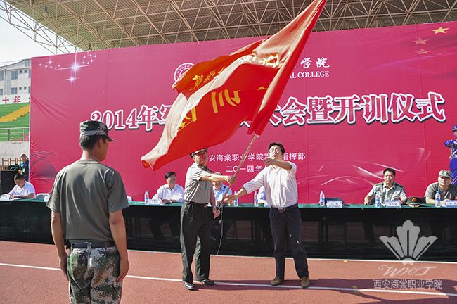 系列发言结束后,职业学院副院长、2014年军训团政委吕博向2014军训团团长、陕西省军区鹏程学生军训教官派遣队徐长福上校授2014年军训团团旗。职业学院院长冯居秦宣布海棠职业学院2014年军训工作正式开始。在激昂的解放军军歌声中,海棠职业学院2014军训动员大会暨开训典礼圆满落幕。