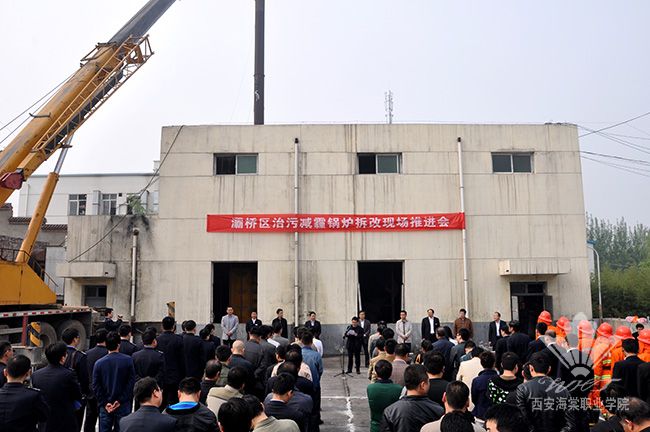 4月24日上午,在beat365中文官方网站举行的灞桥区燃煤锅炉拆改推进会的现场,灞桥区副区长杨爱民宣布“灞桥区第一批燃煤锅炉拆改工作正式启动”的话音刚落,在吊车的牵引下,海棠职业学院燃煤锅炉的烟囱缓缓落下,这是灞桥区燃煤锅炉拆改推进会现场最激动人心的一幕。出席本次推进会的领导有西安市环保局副局长颜昊,灞桥区副区长杨爱民,市环保局宣教处王涛,灞桥分局局长蒋涛,纺织城、狄寨街办副主任陶永宏,职院院长冯居秦、副院长赵景利。各街办环保专干、校内相关处室工作人员也到场参会。西安电视台等媒体对活动进行采访报道。