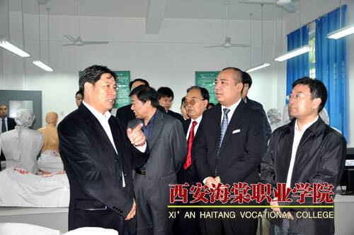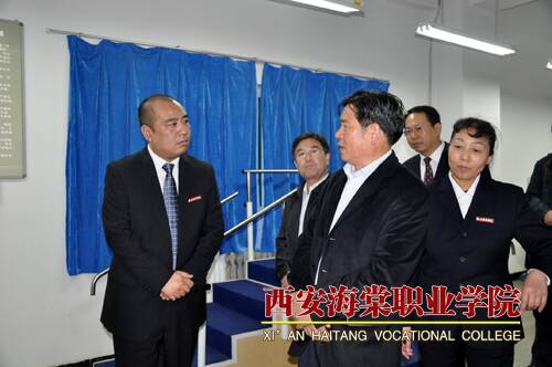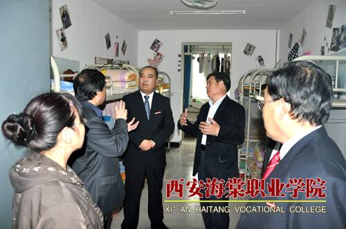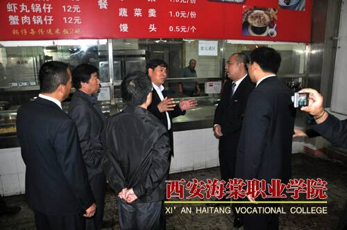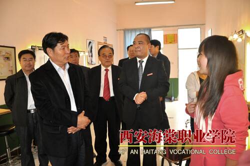 随后,在王卓董事长、院长冯居秦、党委书记冯齐昌的陪同下,杨厅长一行参观了美丽的海棠校园。在海棠短训部,杨厅长与学习化妆的几位学生进行了亲切的交谈,深入了解了化妆、针灸、美甲等专业的理论学习、技能培养、就业情况等。在海棠医务室,杨厅长关切地看望了正在打吊针的大一新生,在对学生的病情有所掌握后,他言辞恳切地说,希望他们尽快好起来,以健康的身体和饱满的精神状态投入到学习当中。在第一餐厅,杨厅长主要视察了“壹元区”的菜品、菜类陈列、卫生状况等,并指出安全饮食、健康饮食是后勤保障工作中的重中之重,一定要把好关、服好务。