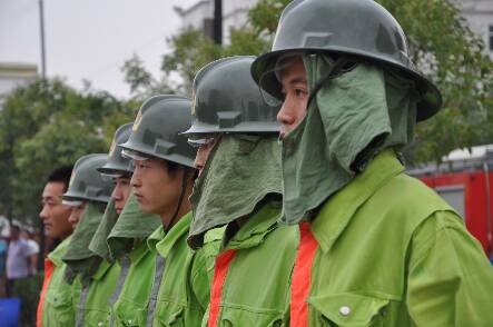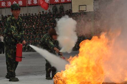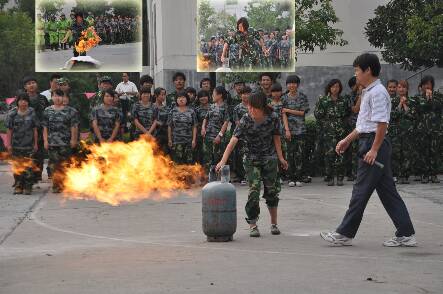讲座结束后,消防队组织各连队学生代表进行现场防火演练。消防员利用火盆、燃烧的煤气罐分别向大家演示了使用石棉被、灭火器灭火的要领。在老师的帮助下,学生代表分组上场进行实战演练。
