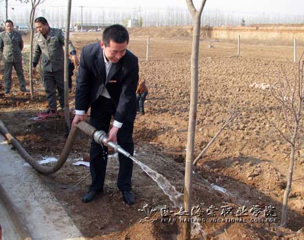 一路上,同学们有说有笑,都兴奋的期盼着亲手种下一棵棵希望之树。到达目的地后,同学们扛着铁锹,男女搭配开始植树。只见他们先把树栽进坑里,然后拿铁锹往里面铲土,整个植树过程显得井然有序。同学们认真的干着,问及他们有什么感想时,都激动地说很开心,这次活动十分有意义。学院还专门派了消防车为新栽树木浇水。