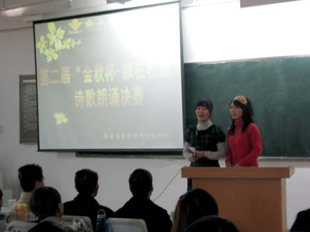 2010年11月10日下午16:30,学院第二届“金秋杯——飘在校园”经典大型诗歌朗诵总决赛在三号教学楼二楼3221教室隆重举行。