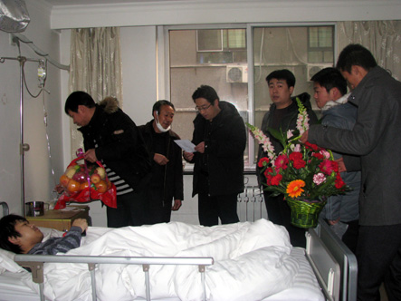 2009年12月17日下午,副院长吕波、宣传处处长谢元龙、学生处处长王文强、管理学院副院长夏亚兵、团委书记谢波、辅导员王小玉等一行9人前西京医院探望我院学生樊二飞。