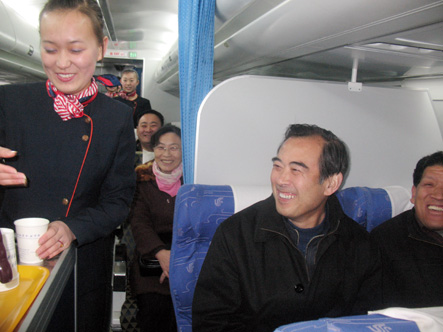 在参观模拟机舱时,空中乘务专业学生在机舱内的现场演示让领导们感受到了头等舱的服务。悠扬的音乐响起,熟练的操作技术,得到了参观领导的好评。