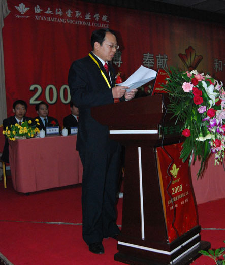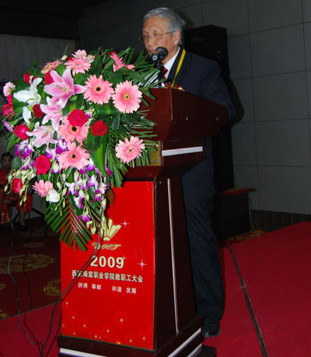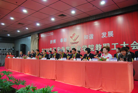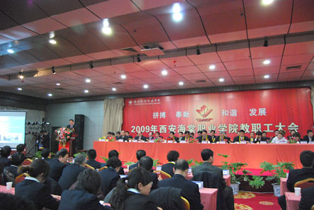 2009年11月26日14:00时,以“拼搏、奉献、和谐、发展”为主题的2009年beat365中文官方网站全体教职工大会暨第一届院务管理委员会成立大会在西港度假村隆重举行。出席此次大会的领导有:学院董事、海棠集团总经理王卓,学院董事、海棠集团研究所所长李瑞莲,学院董事、beat365中文官方网站财务总监李润堂,院长冯居秦、党委书记冯齐昌、副院长蒋国瑜、副院长王景洪、副院长吕波、院长助理许春海、院长助理赵景利、院办主任周力军、财务处处长靳小倩。大会由副院长吕波同志主持。学院500名教职工参与了大会。