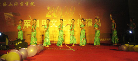 演出中,各连队和教官们自编自演了丰富多彩的节目,有唱歌、舞蹈、小品、诗朗诵、舞台剧、器乐等。动感十足的街舞表演, 清新醉人的乐器演奏,令人捧腹的相声表演,深情温婉的歌曲演唱,现场气氛热烈,掌声不断。 师生们用动听的乐曲,优美的舞姿,充分展现了当代大学生的良好精神风貌,讴歌了军民鱼水深情,教官们以雄壮的军歌、刚劲的动作,演绎出人民解放军的风采。十四连的一首《开门红》拉开了军训汇演的帷幕,轻松欢快的节奏,热情奔放的舞姿,展示出了当代大学生的精神风貌。舞蹈表演成了今年的一大亮点,带有民族特色的《新疆舞》、《顶碗舞》,带有军队气息的《军中姐妹》都给学生们留下深刻印象。带有东北民族特色的东北民歌对唱,更是赢得了在场观众的一致好评。军训团团长的一首《草原上升起不落的太阳》更是把会场气氛推向了高潮。教官们精彩的《武术》节目,引人入胜的表演令人目不暇接,赢得了广大师生阵阵热烈的掌声。最后在一首《盼团圆》的精彩表演中,文艺汇演划上了圆满的句号。