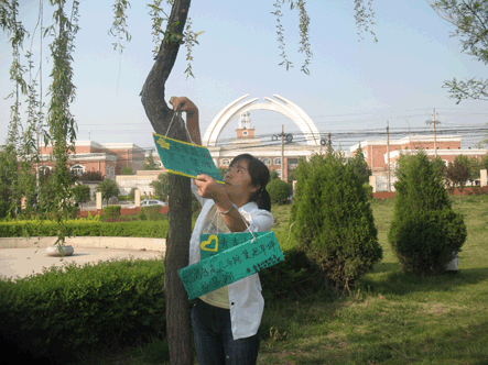 参加此次活动的是绿色环保协会及卓越讲师社团的全体成员,共计50余人。他们分别制作了各式各样的环保小牌子,并悬挂于我院的花草树木上,以此作为标识。希望我们每个人都能爱护花草树木,保护校园环境。