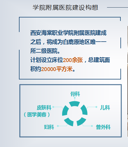 beat365中文官方网站是以医学美容、医学技术专业群为特色的高等院校。随着社会老龄化步伐的逐步加快以及二胎政策的全面开放,会议认为将着力在医疗、科研、教学、养老等方面继续探索深入发掘,并结合海棠学院专业特色,打造“美容整形外科”、“口腔科”、“妇产科”、“康复治疗科”争取做到一次规划分步实施,尽快将医院建设项目落地。为白鹿原大学城、白鹿原现代观光农业示范区广大师生及人民群众提供优质的医疗服务保障和便捷的就医途径。