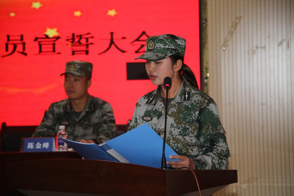 战士代表刘登杰发言,他首先感谢学院的培育,感谢学院给同学们提供一个奉献和培养自身能力的机会。讲述了自己作为一名学生通过层层选拔最终进入学院预备役的成长历程,并且表示今后在预备役队伍中服从命令,听党指挥,忠于祖国,忠于人民;严格遵守校纪校规,遵守预备役分队条令条例;诚实正直,自信乐观,吃苦耐劳,甘于奉献。希望未来能够和队员们一起成长,携手努力。