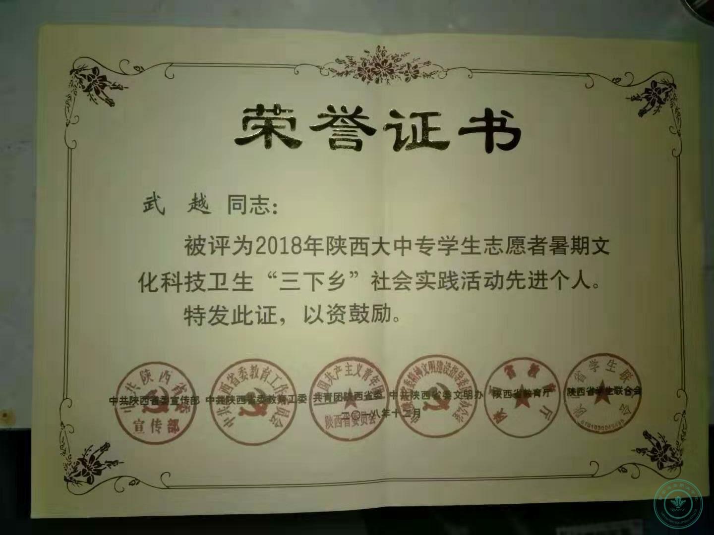 学生干部武越被评为2018年陕西大中专学生志愿者暑期文化科技卫生“三下乡”社会实践活动先进个人