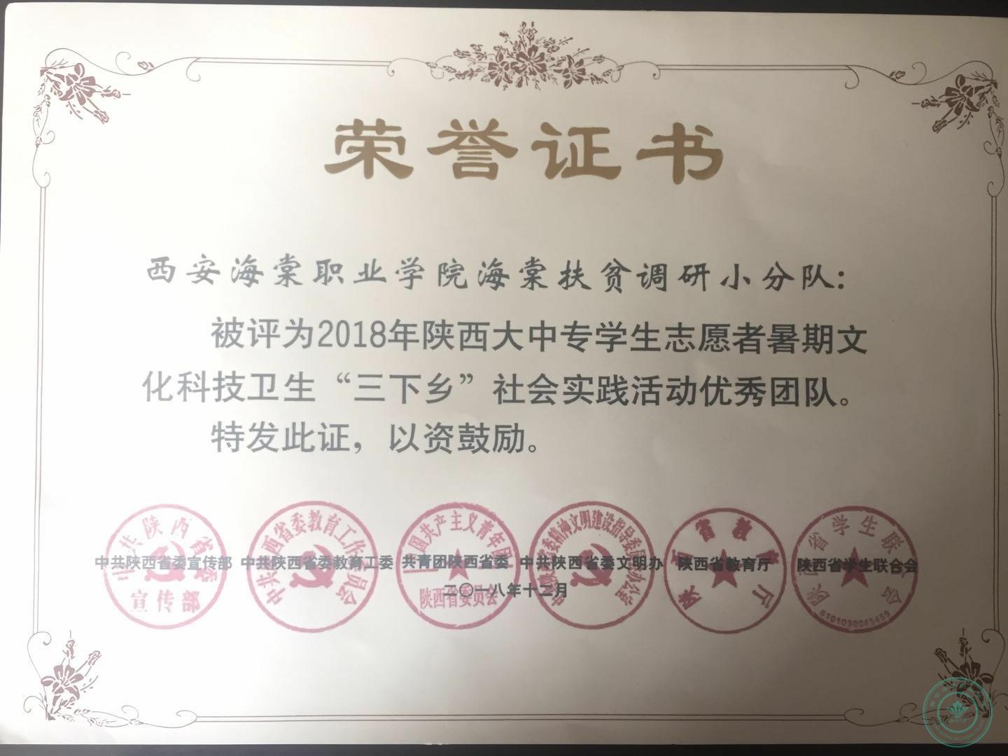 海棠扶贫调研小分队被评为2018年陕西大中专学生志愿者暑期文化科技卫生“三下乡”社会实践活动优秀团队