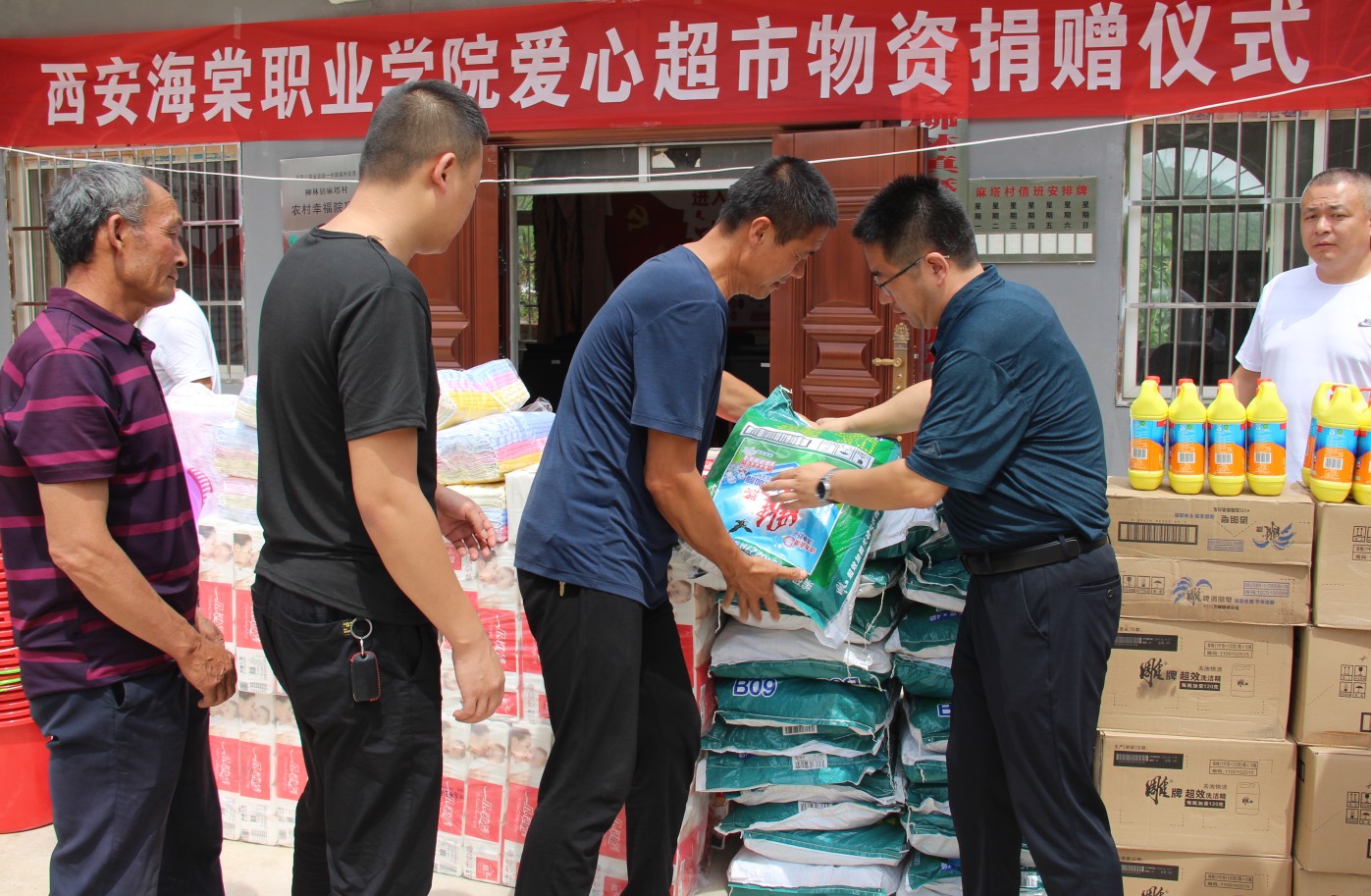 7月24日,我院党委副书记吕波、副院长高琦带领扶贫办一行人赴延安市宝塔区柳林镇,为柳林镇5个村的“爱心超市”捐赠物品。双方在麻塔村委会举行了简短的捐赠仪式,并向各爱心超市分发了物品。