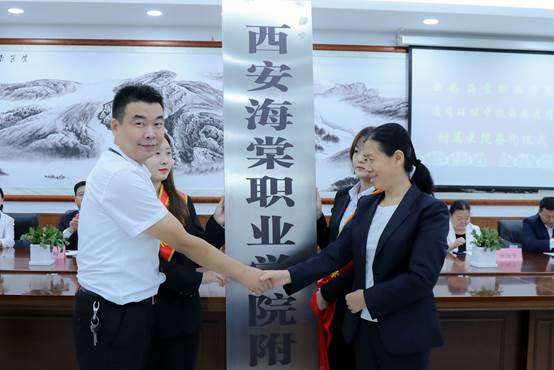 随后,在与会人员的见证下,我院杨国峰副院长与通用环球中铁西安医院侯红武助理签署医教合作协议。我院陈晓东副院长与通用环球中铁西安医院宋千钧副院长共同为附属医院揭牌。