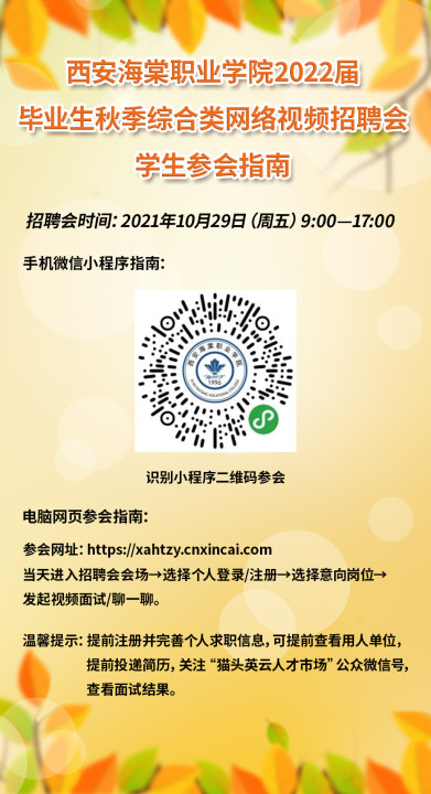 为了更好的服务用人单位招聘我校毕业生,同时为毕业生搭建一个方便精准的就业服务平台,我校定于2021年10月29日举办“beat365中文官方网站2022届毕业生秋季综合类网络视频招聘会”,诚邀贵单位参加。现将有关事项函告如下: