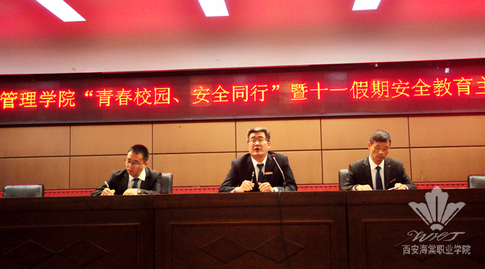9月27日晚,我院在学术报告厅举行了以“青春校园,安全同行暨十一假期”为主题的安全教育报告会。参加此次会议的领导有:我院院长高琦、副院长秦志春、科长左海里,团总书记王典、王海利及2017级各班辅导员。会议由王海利书记主持。