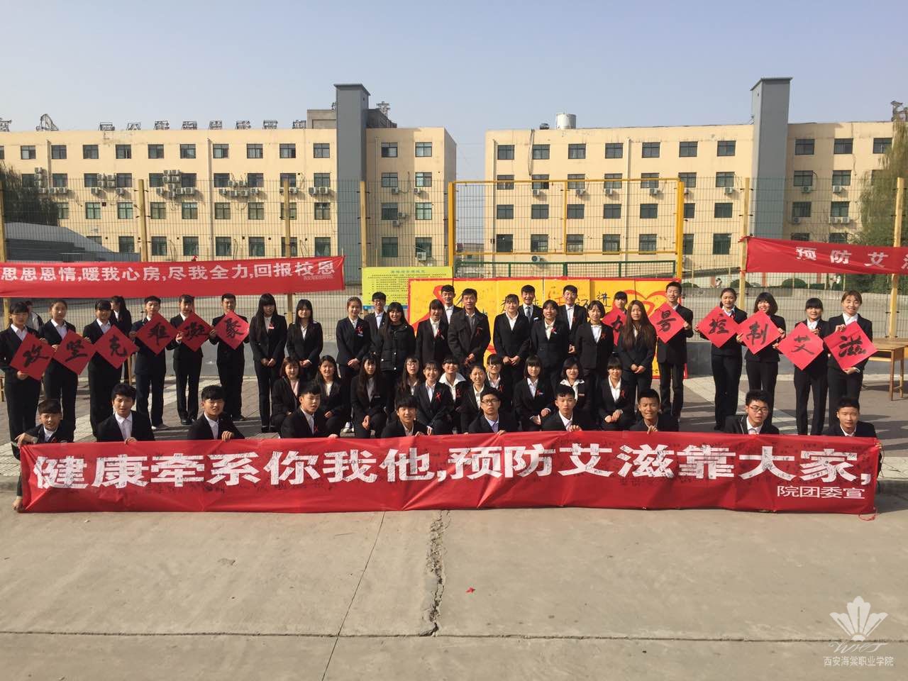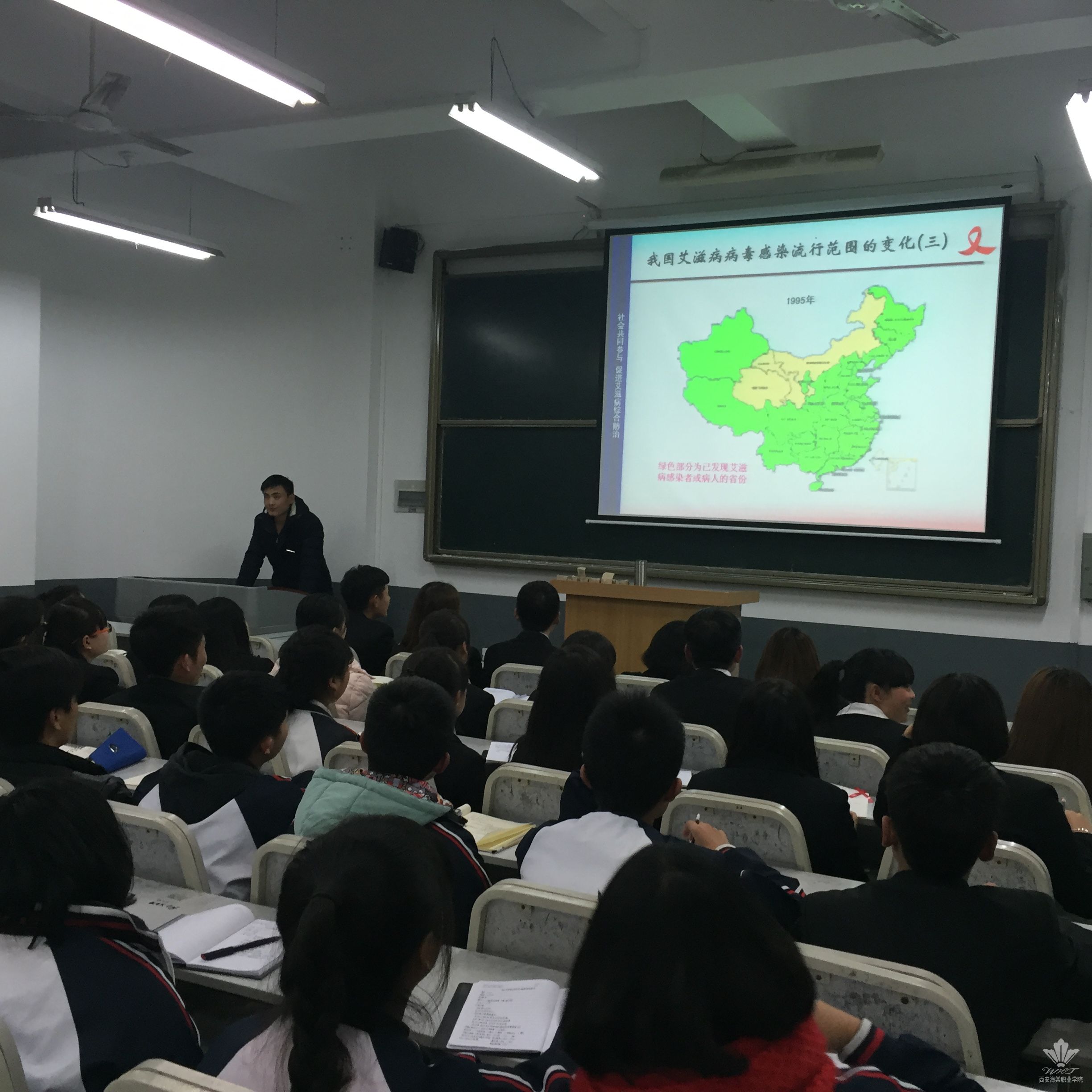 12月1日12时,我院团学干部在排球场设立了“健康牵系你我他,预防艾滋靠大家”横幅签名仪式点。活动初始,我院全体师生及过往师生纷纷来到横幅前签名,团学干部为每位前来签名师生发放并佩戴“红丝带”,向他们讲解有关艾滋病的预防知识。12月1日晚,我院在2213教室举办“社会共同参与促进艾滋病综合防治”青少年艾滋病知识讲座。我院学生科科长王霄从艾滋病基本知识、艾滋病流行形式发展趋势、艾滋病的特点、艾滋病的传播途径等方面进行全面的讲解,让学生掌握艾滋病的基础知识,懂得如何有效预防艾滋病,以及在日常生活中应注意的相关事项。王科长说,每位同学都要遏制艾滋,珍爱生命,洁身自好,树立正确的对待艾滋病的态度,关爱艾滋病人,不歧视艾滋病人,为抗艾滋出一份力,使得艾滋病患者有一个宽松的生存环境,不敌视社会,与周围人群和谐相处。