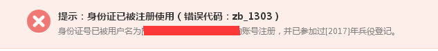 4、部分学生在登录全国征兵网进行兵役登记时可能会出现下图情况,若身份证号码为本人身份证号,则为地方县(区)武装部已代为兵役登记。