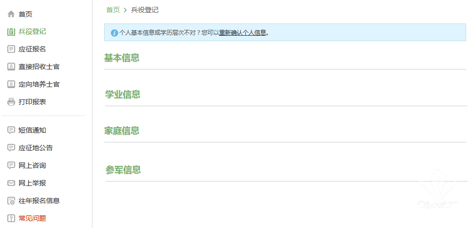 点击“我已阅读兵役须知”之后,你的面前会出现一张很大很大的表格,仔细一看可以知道这个表格分为了“基本信息”“学业信息”“家庭信息”“参军信息”四大类。